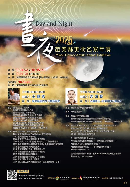 ▲苗栗縣政府文化觀光局10月12日(星期日)上午09:00至16:00舉辦2025苗栗縣美術名家年展「晝夜」2場名家講座,邀請兩位縣內藝術家分享創作歷程與理念。