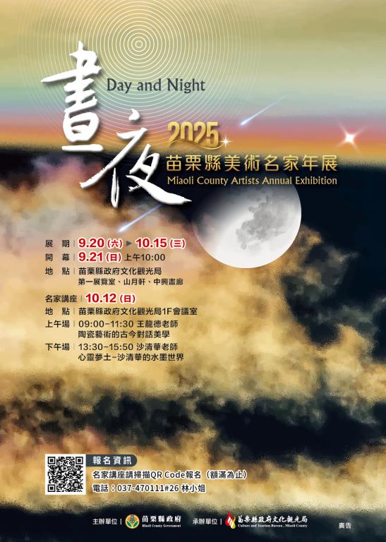 苗栗縣政府文化觀光局自114年9月20日起至10月15日止,於第一展覽室、山月軒、中興畫廊盛大舉辦2025苗栗縣美術名家年展「晝夜」,並於9月21日(日)上午10時在第一展覽室舉行開幕式;此展覽採自由入場,讓喜愛藝文的欣賞者與藝術家們共聚一堂,在晝與夜的交替節奏中,觀照過往、沉澱當下、展望未來,透過藝術語彙點亮生活節奏中的光與影。