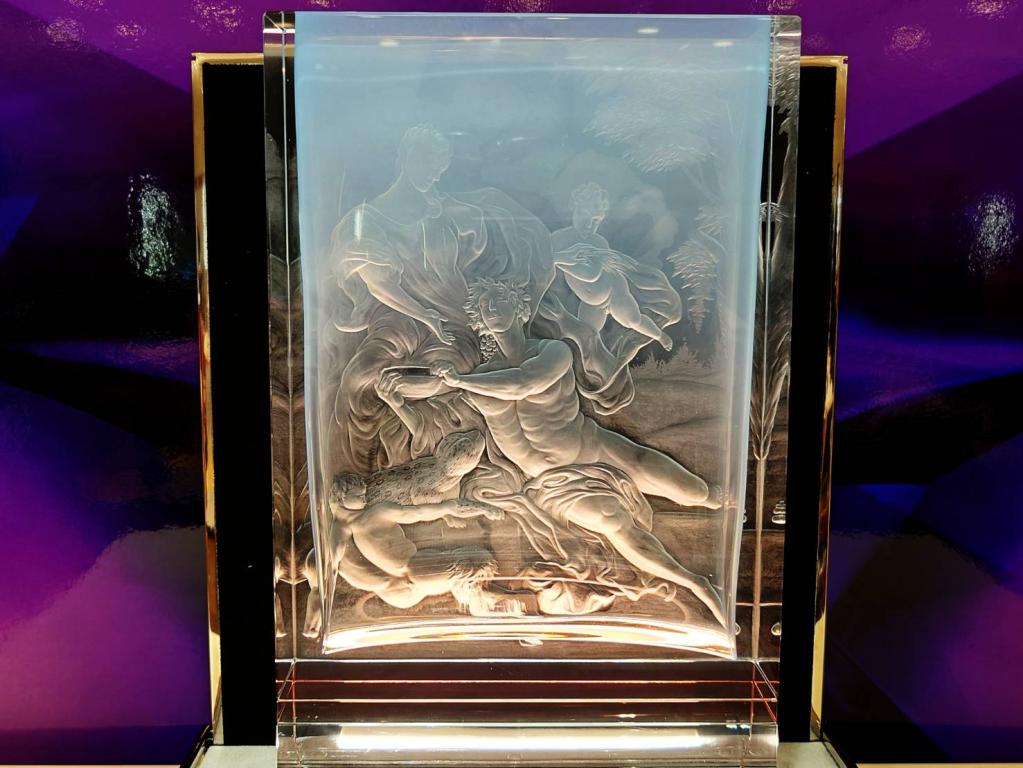 雷瑟、史沃博達、賽林格三位大師擅長以精湛技藝演繹古典名畫與神話故事,讓水晶不再只是藝術品,而是文化與歷史的承載體。今年,雷瑟大師以《伊卡洛斯的飛行夢》探討神話中的自由與墜落,雕工細膩,饒富哲思;另一件作品《天使之翼》則挑戰非傳統語彙,展現創新視野。曾獲法國「藝術與文學騎士勳章」的他,其作品歷來備受收藏家追捧。