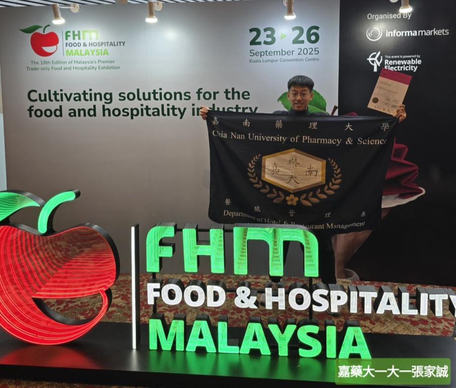 餐旅系師生同時遠赴馬來西亞,參加FHM吉隆坡廚藝大賽,該賽事是東南亞最大型廚藝賽事之一,匯聚全球飯店主廚與專業廚師團隊,王明煌老師榮獲專業組佳作,陳祐恩、黃至緯、新生張家誠各摘下佳作獎項。