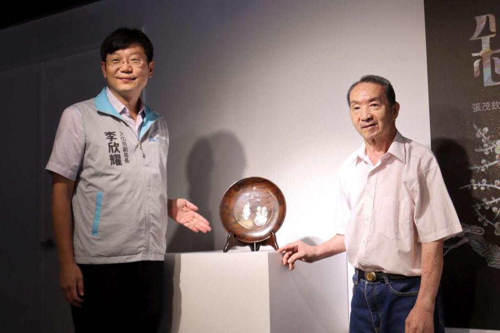 ▲張茂欽螺鈿薪傳展「鏤光承鈿」今(10/9)日開幕會盛大登場,張茂欽老師(右)致贈作品《納福迎春》予新竹市政府典藏,並和竹市文化局李欣耀副局長合影。(圖/竹市府提供)