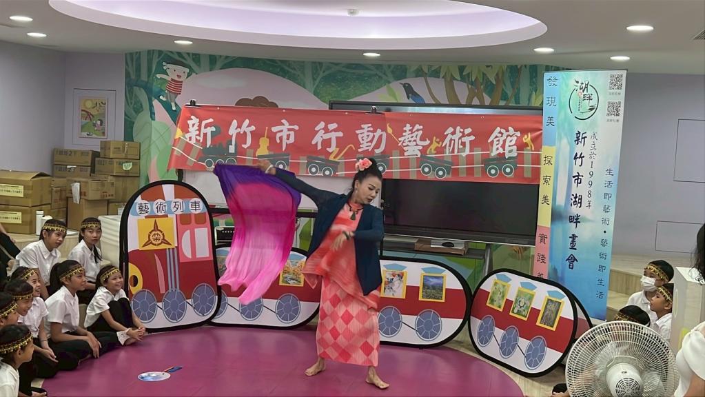 ▲「2025新竹市行動藝術館巡迴展」第三站科園國小熱鬧展開,藝術家陳銘真帶來的開場舞蹈。(圖/竹市府提供)