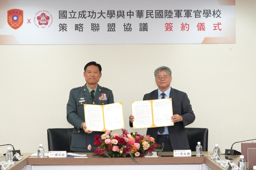 【勁報記者于郁金/臺南報導】國立成功大學與中華民國陸軍軍官學校為促進學術與文化交流,推動科技創新之研發,16日於成大光復校區雲平大樓會議室簽署策略聯盟協議,雙方將就人才、設備、技術及學術資源等進行實質合作與研究,共同為國家培育具有宏觀視野、高素質之軍官與人才。