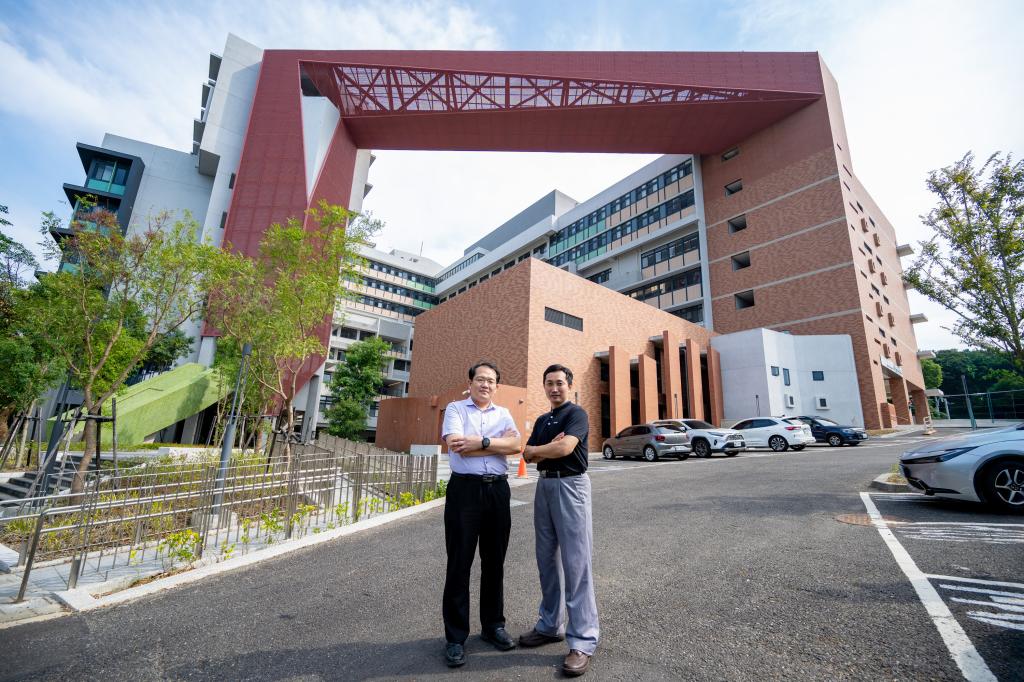 ▲竹師教育學院院長王子華(左)與副院長王淳民(右)在新大樓前合影,背後紅色橫樑象徵「弘道之門」,寓意師道傳承。(圖/清大提供)