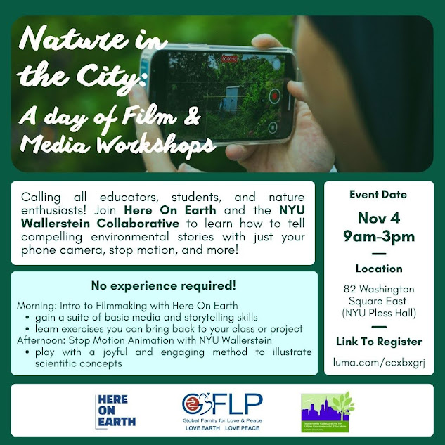 靈鷲山Here on Earth 青少年環保媒體教育計畫團隊,在今年秋天紐約氣候週活動中,與一群環保教育工作者分享教育計畫的成果,引起現場熱烈的討論。 團隊成員並與主辦單位紐約大學(NYU)環境保護及永續教育教授 Mary Leou有著共同的想法——動人的故事性敘述在推廣環保議題時更能激起人們的行動及共鳴,然而一般人鮮有機會接受這樣的教育,為了讓這樣的學習機會更普及,且不局限於課堂中,在Mary Leou教授引薦下,紐約大學華勒斯坦城市環境教育合作中心(Wallerstein Collaborative for Urban Environmental Education)與愛與和平地球家GFLP攜手合作了《影像與媒體工作坊一日體驗日》。