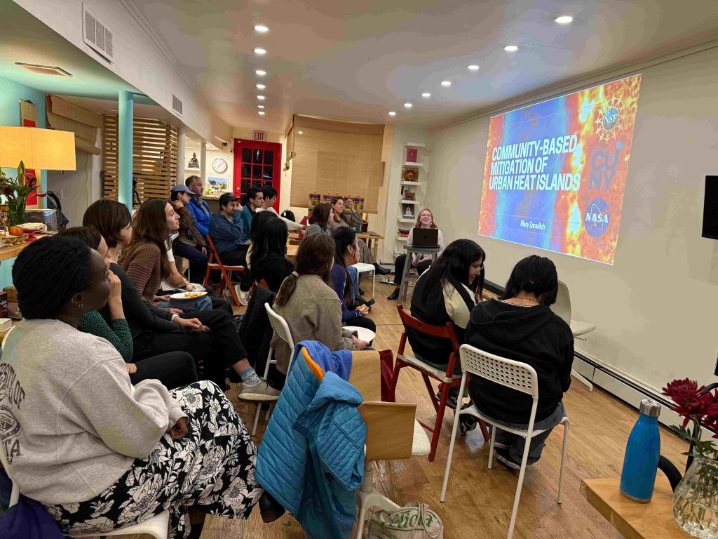 另一位講者 Mary Zaradich,為氣候行動倡議者,畢業於哥倫比亞大學機械工程與政治學系,曾任NASA戈達德太空研究所(NASA Goddard Institute) 研究助理。她在演講中分享其研究成果——都市熱島效應(Urban Heat Island, UHI)的形成與緩解策略。Mary 指出,熱島效應在低收入與黑人、原住民、有色人種社區中特別嚴重,這些地區因早期城市發展中資源分配不均,缺乏綠地、公園與良好的基礎設施,建築密集、通風不良,導致環境溫度長期偏高。然而,也正是這些社區,在地居民展現出創新與韌性,她分享帶領居民率先推動屋頂花園、綠色屋頂、社區氣候教育的案例,她的分享也讓觀眾看到由下而上的公民力量。
