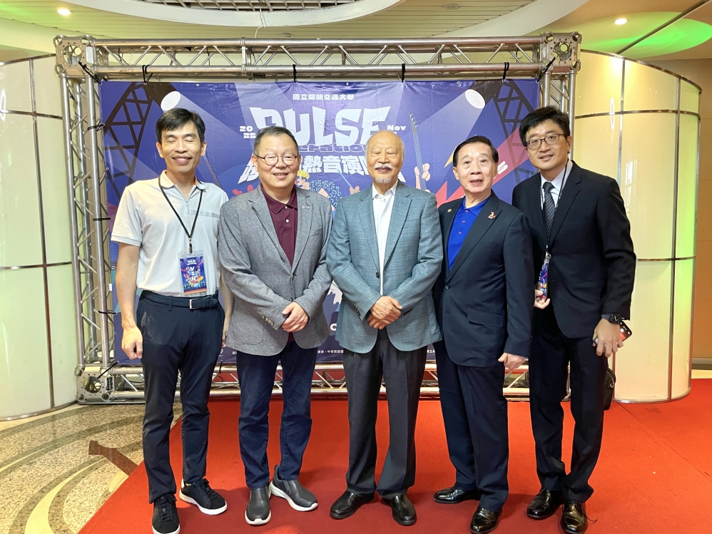 ▲陽明交大傑出校友李良猷發起的「PULSE Generations 跨世代熱音演唱會」,陽明交大校長林奇宏(左2)和與會貴賓合影。(圖/陽明交大提供)