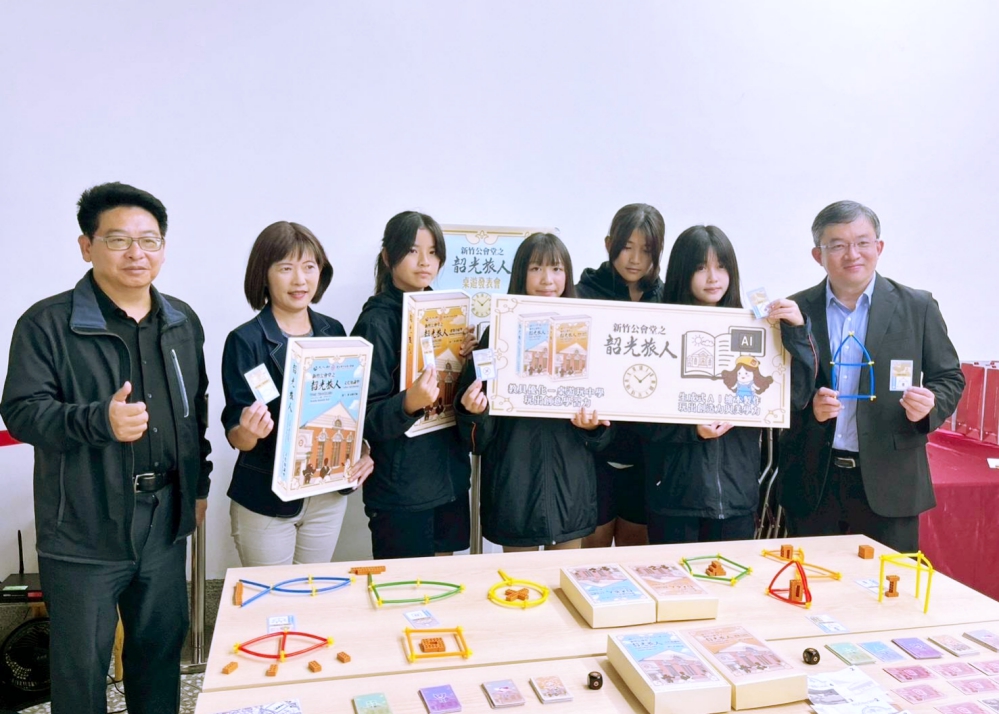 ▲竹美館發表推出「新竹公會堂:韶光旅人」桌遊,精華國中學生發表用生成式AI創作的《新竹公會堂》繪本故事。(圖/竹美館提供)