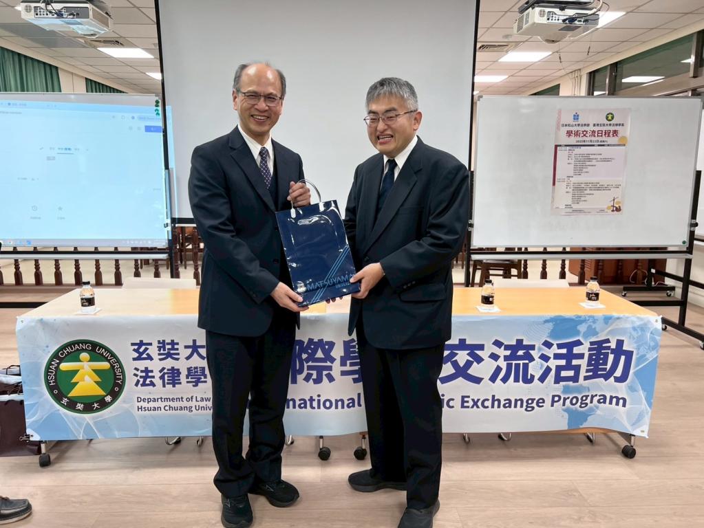▲玄奘大學法律學系李錫棟教授(左)與松山大學法學院明照博章教授(右)互贈交流禮品。(圖/玄奘大學法律提供)