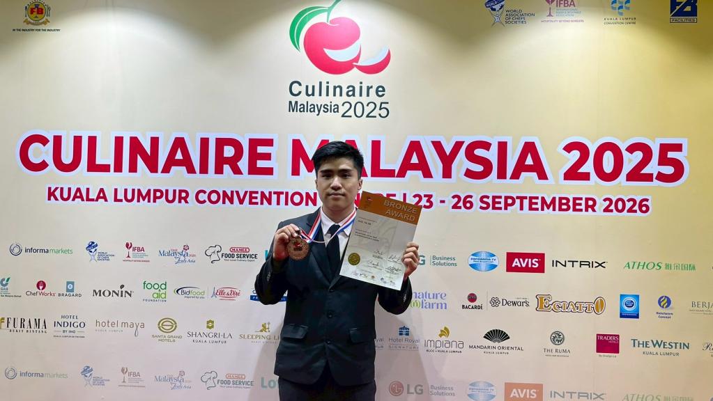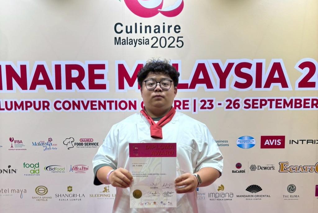 【勁報記者于郁金/臺南報導】台南應用科大養生休閒管理系再次展現教學實務卓越成果,日前由鄭傑夫助理教授及帶領學生郭亞恩、林以新2位同學於日前往馬來西亞,參加2025FHM馬來西亞吉隆坡廚藝大賽,以精湛西餐鮭魚主餐競賽及外場水果火焰桌邊烹調服務,兩項比賽贏得評審高度肯定,一舉奪下1銅1佳作好成績,全校師生咸感與有榮焉。