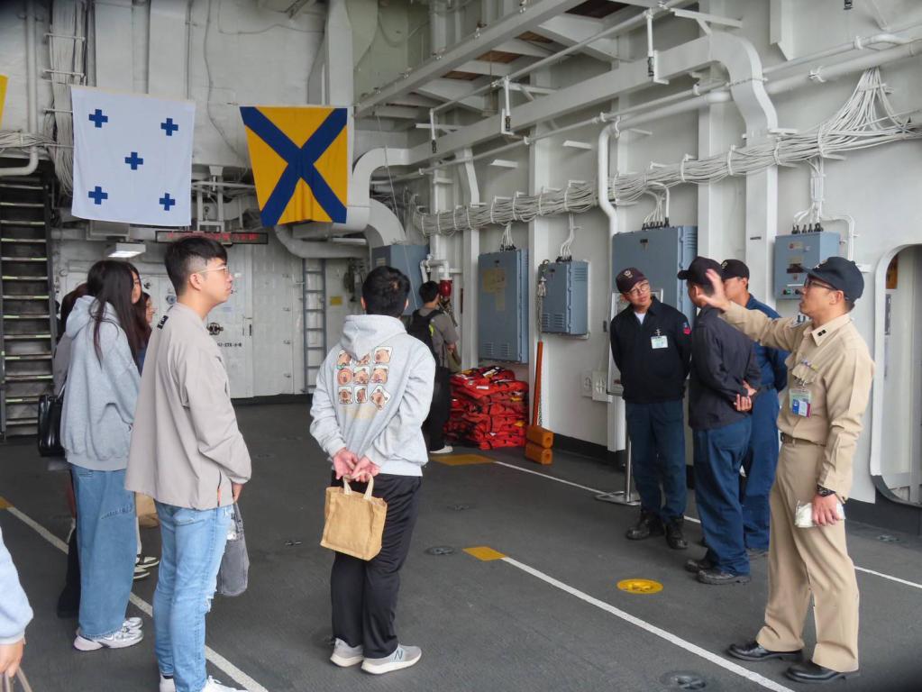 隨後,師生前往高雄海軍旗津基地進行參訪,透過近距離觀察艦艇裝備、勤務空間與任務編組,實際感受海軍在國防策略與海疆安全中所扮演關鍵角色,參訪活動不僅增進學生對軍事工作的理解,也提升年輕學子對志願役與ROTC職涯興趣。