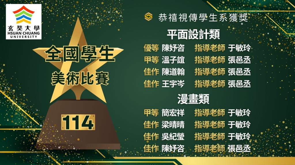玄奘大學視覺傳達設計學系於今年全國學生美術比賽再度取得優異成績,學生在漫畫類與平面設計類共獲得「特優、甲等、佳作」等多項獎項;其中,漫畫類奪下特優,從敘事、構圖到角色塑造皆受到評審肯定。玄奘大學視覺傳達設計學系近五年累計獲得三次特優與四次前三名,展現視傳系在創作訓練及教學品質上的穩定能量。
