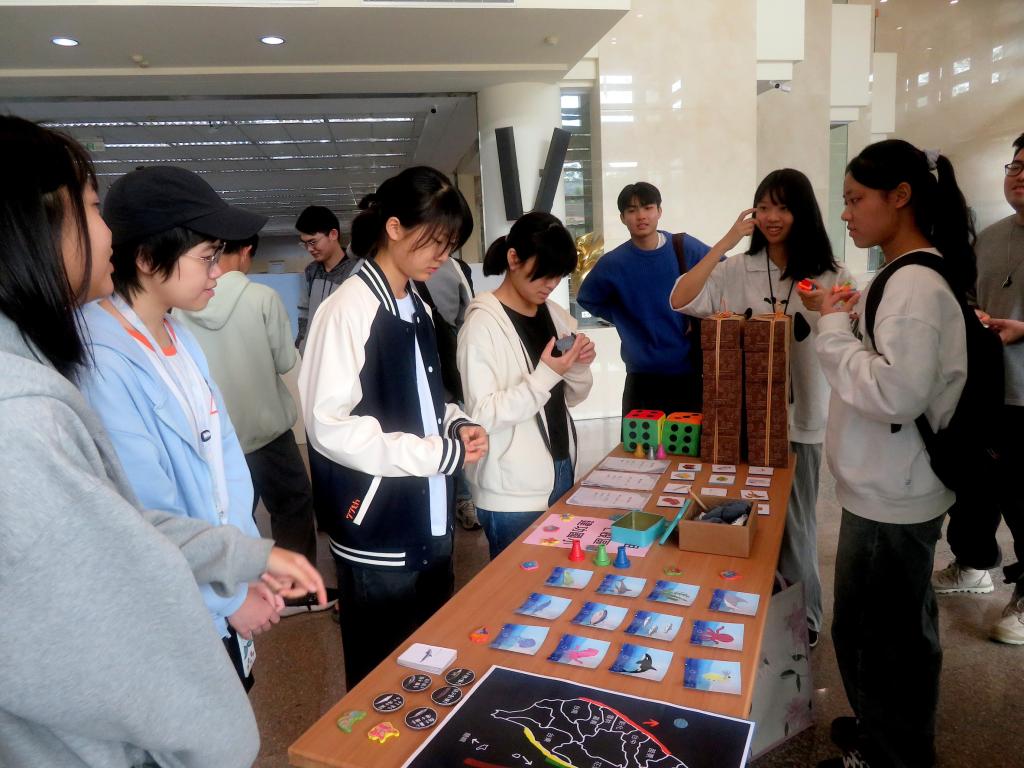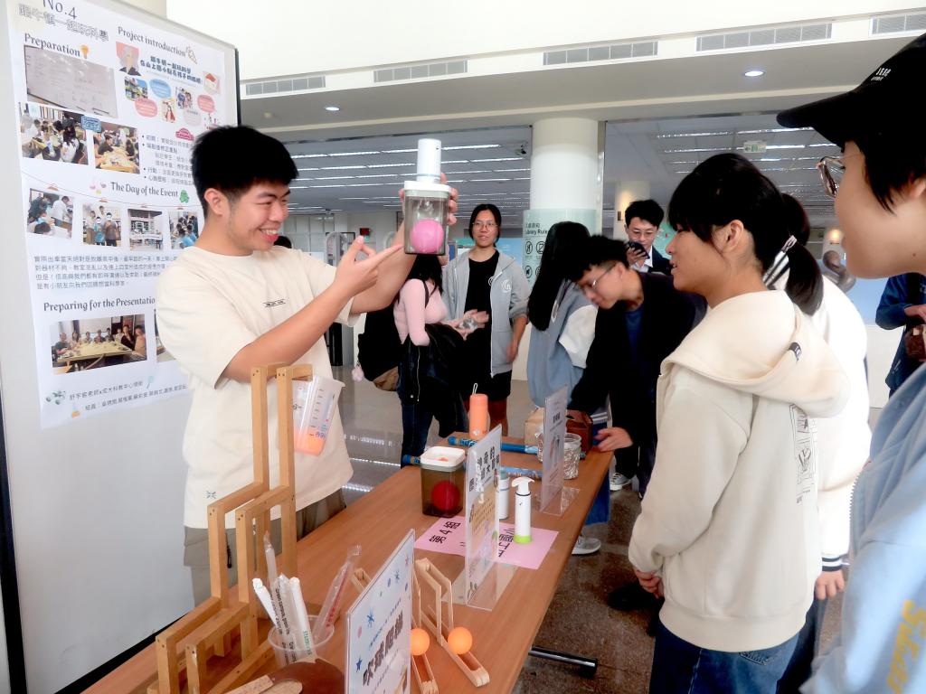 明亮寬敞圖書館大廳展示「成大Book 一市」課程中同學豐富成果,小組組員們熱情分享自己創意,包含自己設計海報、小遊戲和各種道具,內容精彩有趣;課程中,小組自行約定上課地點、發想閱讀主題,並將討論過程以至少100字敘述搭配照片或影片,在下課前傳FB課程社團;各小組在每位老師帶領下,對自己組別專屬主題,進行構思及討論,不僅配合中心主題,也讓來自不同系級學生可依其所學加入更多元教學。