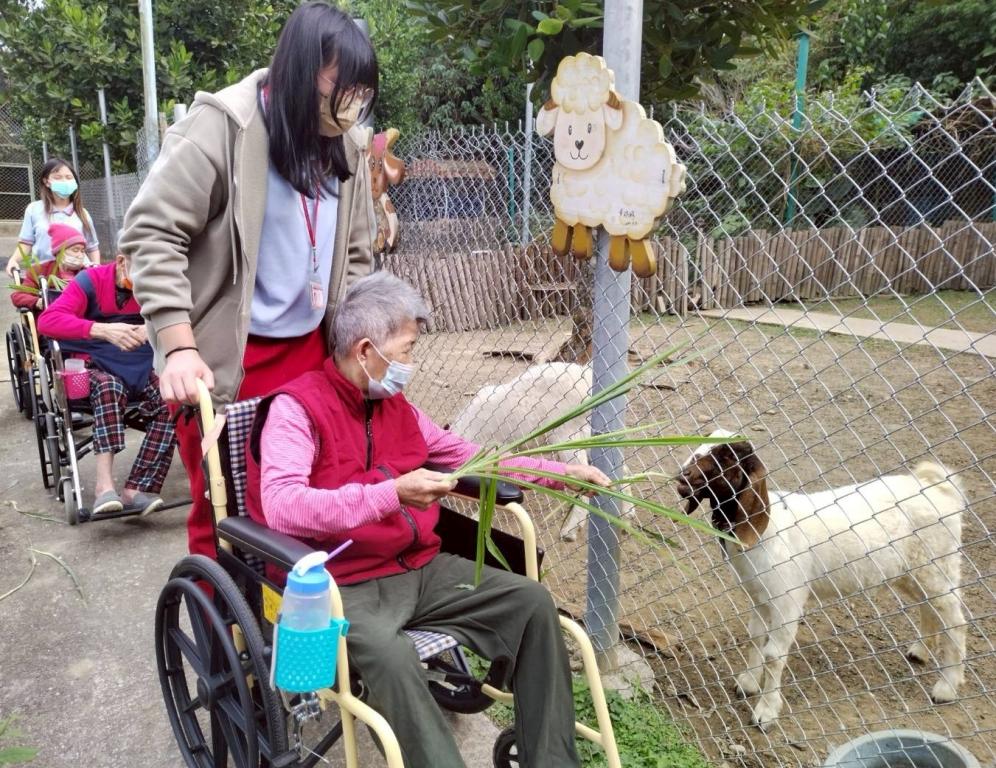 榮家說明,在溫暖冬日陽光下,同學們推著長輩在樹木扶疏、綠意盎然家區中,緩緩漫步至榮家內動物園區;在動物園區,長輩們親手餵養園內動物,與可愛生命進行互動;這項活動成功實現動物輔助治療(Animal-Assisted Therapy)正面效果;與動物活潑可愛互動,瞬間融化長輩們心房,他們臉上揚起久違笑容。