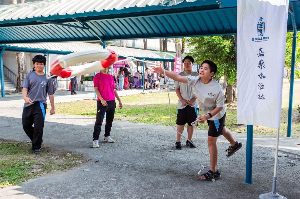 除了往外推廣水域知識外,嘉藥水活社也在校內舉辦「玩水有道安全至上」水域安全推廣日,現場除了基本救生圈拋套練習,更將泳池搬進校園,讓同學在校內就能實際體驗划獨木舟的樂趣,強化水域安全技能。