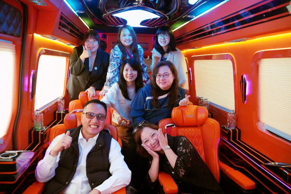 ▲這次活動由愛情可樂糖公關承辦總監吳雅閔(前排右1)統籌規劃,以溫柔而穩定的節奏串聯公益、講座與交流,讓每一份用心被看見。赫曼咖啡王進忠總經理(前排左1)和與會網紅們,一起在賓律租賃公司公益支持的賓律豪華保母車內開心合影。(圖/主辦單位提供)