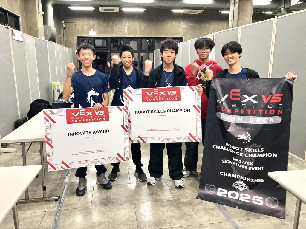 ▲由亞太美國學校(PAS)主辦的2025 PASVEX V5 機器人旗艦賽12/20圓滿謝幕。獲獎隊伍中表現相當亮眼之一,由竹苗區7位國高中學生共組的頂尖團隊,成功拿下ROBOT SKILLS CHAMPION及INNOVATE AWARD兩項殊榮。