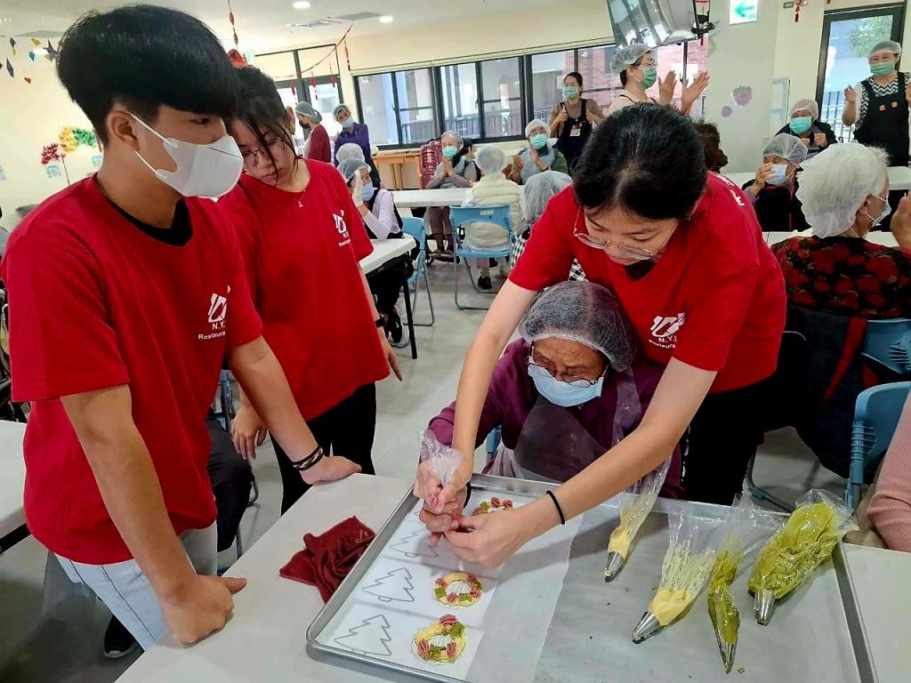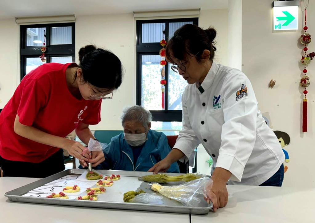 烘焙流程循序進行,從理解步驟到實際操作,有助於維持專注力與順序概念,對失智住民而言,是一種低壓力、生活化且充滿成就感認知刺激方式;過程中,學生志工細心陪伴、耐心引導,在輕柔音樂與溫暖鼓勵氛圍下,引導長輩分享過往家庭烘焙與過節回憶,讓笑聲與故事在彼此之間自然流動,增進情感交流。