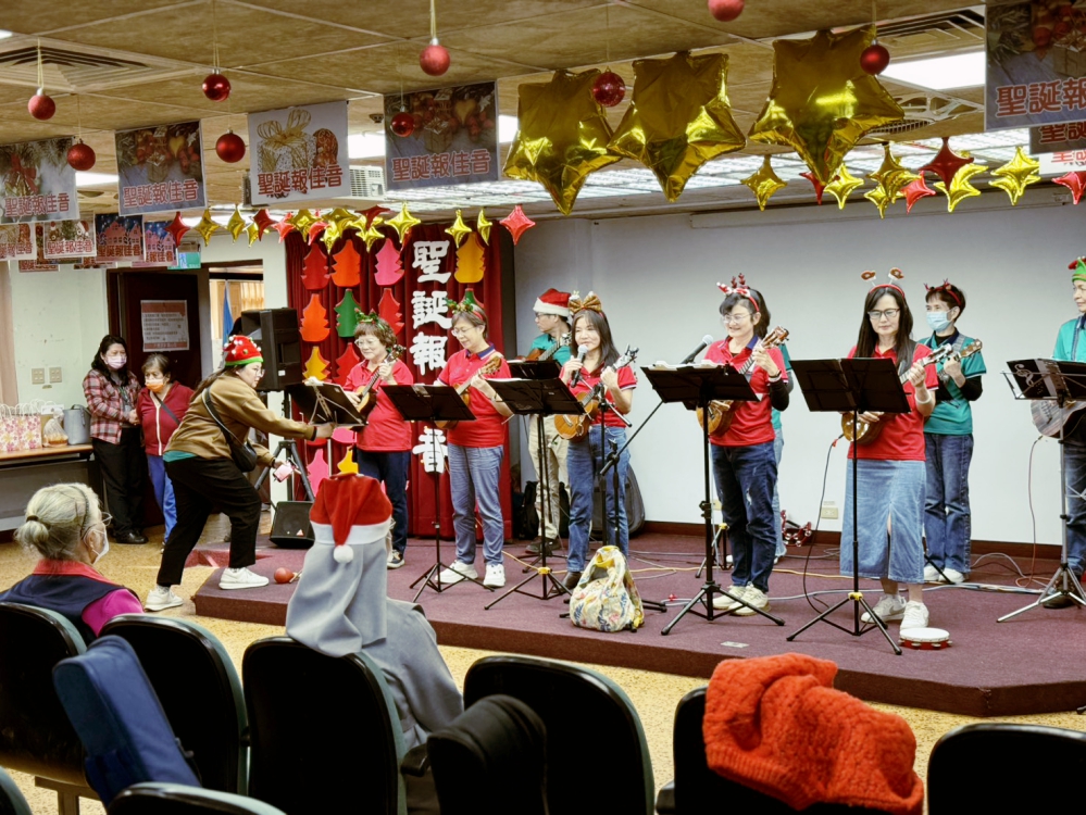 ▲八德榮家舉辦聖誕報佳音活動,邀請志工與幼兒園學童走入榮家。志工團隊演奏烏克麗麗,輕快悠揚的旋律迴盪在活動現場,用音樂溫暖了長輩的心房,為寒冬增添一抹柔和溫馨的色彩 。(圖/八德榮家提供)