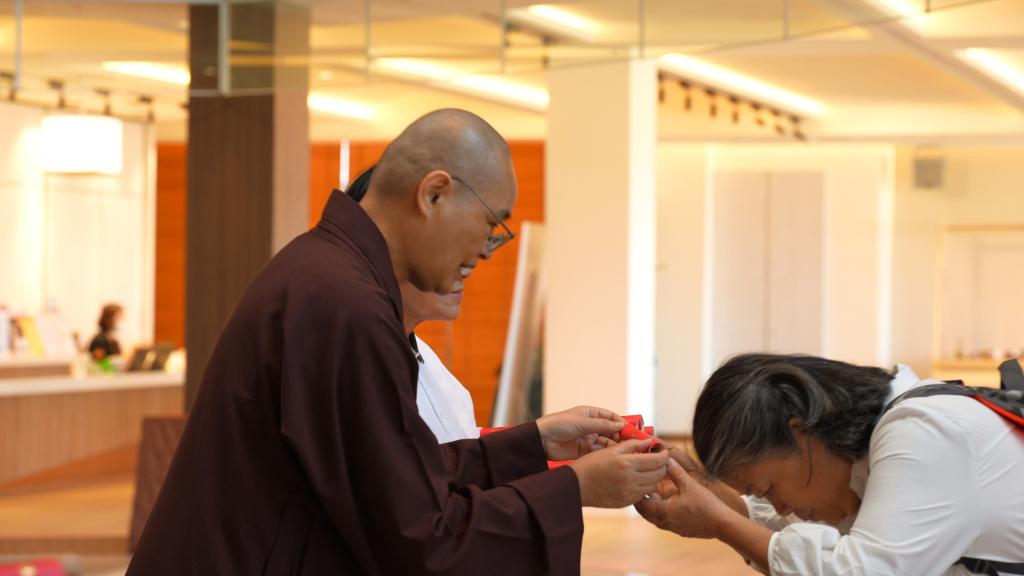 ▲靈鷲山法師在福隆火車站前發春聯給民眾。(圖/靈鷲山佛教教團提供)