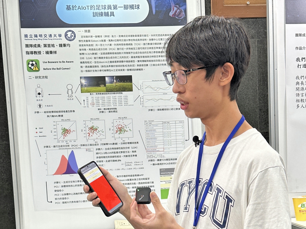 ▲國立陽明交通大學與奇景光電共同主辦的「AI 應用創新菁英培育計畫」決賽暨成果發表會,榮獲銀獎的【基於AIoT 的足球員第一腳觸球訓練輔具】/【Beaware】。(圖/陽明交大提供)