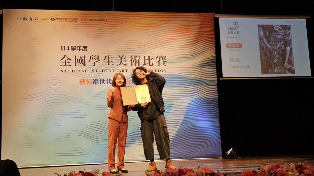 今年比賽依舊是競爭激烈,台南應用科技大學(以下簡稱南應大)美術系學生積極參加此比賽在114學年度全國學生美術比賽中共有15位同學榮獲佳績;頒獎典禮當日,南應大美術系榮獲水墨類大專組特優王偲紜同學、西畫類大專組特優劉柏佑同學,由李泊言館長及蘇憲法教授頒獎並合影留念,為校爭光,值得嘉許。