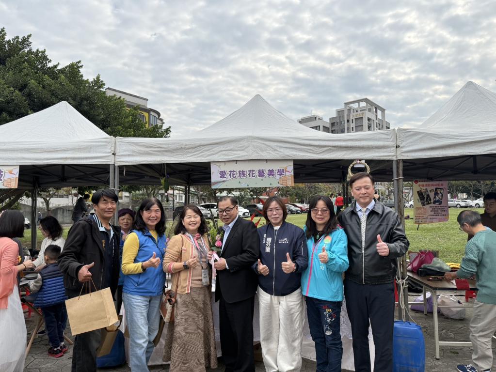 ▲竹縣豐湖社區大學年度成果展盛大且熱鬧登場。竹縣副縣長陳見賢、教育局長蔡淑貞和與會貴賓及豐湖社大學員於成果攤位前合影。