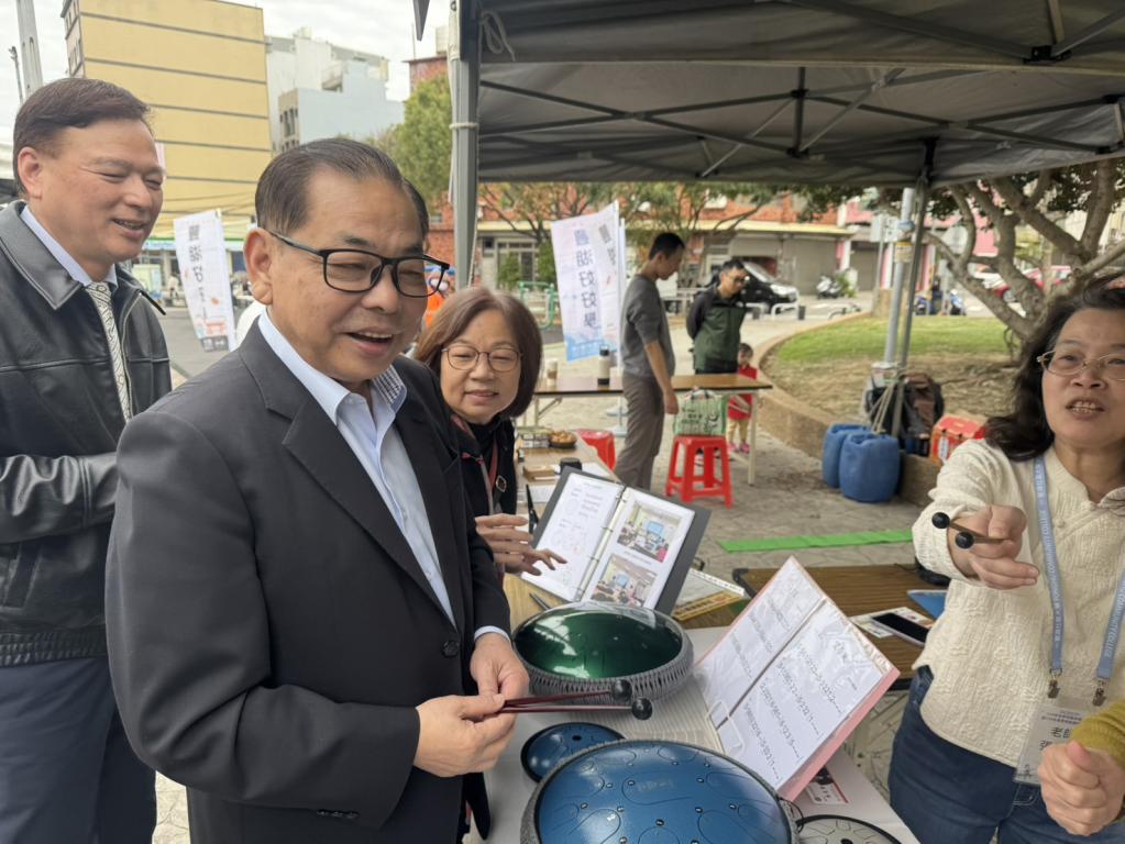 ▲竹縣豐湖社區大學年度成果展盛大且熱鬧登場,竹縣副縣長陳見賢(左2)前往現場各個成果攤位參觀,並親切地與豐湖社大學員們聊天互動。