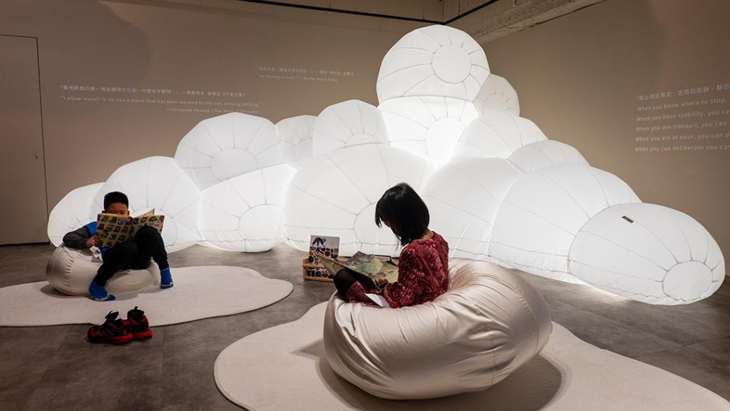 展覽分為4大感官主題展區,以「光彩森林」為起點,利用手持色版與透色片,在灰白的森林結構中「製造可見性」,體悟到觀看世界的方式取決於內心的光。進入「心之雲」,是允許暫停與放空的留白空間,讓緊繃的心靈在巨大蓬鬆的雲朵裝置中獲得沉澱。