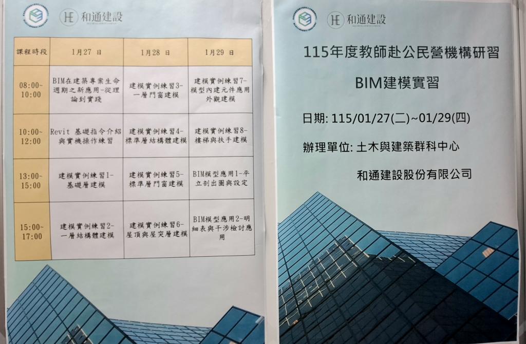 研習期間,和通建設亦提供多項實用BIM教學教材與學習資源,作為教師未來回到各校開設相關課程重要支援;期盼透過本次研習,鼓勵更多教師於校內規劃與開設BIM相關課程,逐步擴大土木與建築群BIM方面之教學能量,共同培育符合產業需求專業人才。
