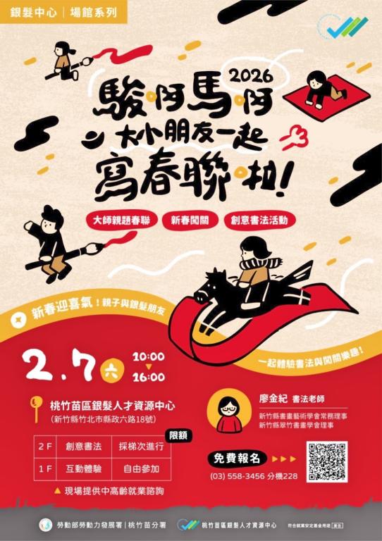 為迎接農曆新年,勞動部勞動力發展署桃竹苗分署所屬「桃竹苗區銀髮人才資源中心」於115年2月7日(週六)辦理「駿啊!馬啊!~大小朋友一起來寫春聯啦!」新春場館活動,結合大師揮毫、新春闖關與創意書法體驗,邀請一般民眾、親子家庭及中高齡與高齡者一同走進場館,在濃厚年節氛圍中體驗傳統文化,同時認識政府推動的中高齡及高齡者就業資源,促進世代交流與社會參與。