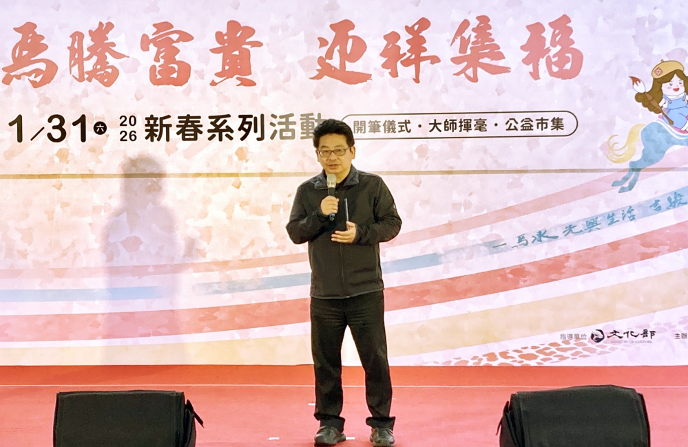 ▲竹美館2026「馬騰富貴.迎祥集福」新春揮毫活動熱鬧登場,竹美館館長葉于正致詞並逐一介紹現場重量級貴賓。(圖/竹美館提供)