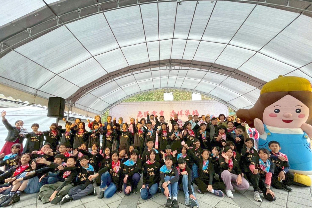 ▲竹美館2026「馬騰富貴.迎祥集福」新春揮毫活動熱鬧登場,開幕表演團體東門國小合唱團也和與會貴賓及美學館吉祥物阿美學姊一同合影。(圖/竹美館提供)