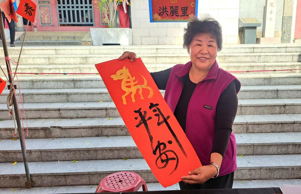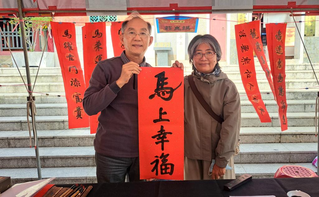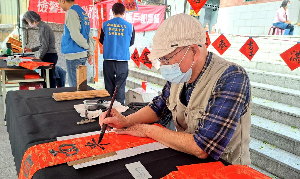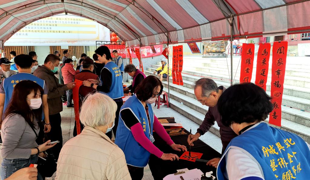 是日下午於廟埕舉行「大師揮毫贈春聯」活動同樣吸引大批民眾參與,仰慕5位書法名家風采民眾早早排隊等候,現場人潮絡繹不絕,年節氣氛濃厚;書法老師們現場揮毫,以一筆一畫書寫吉祥祝福,亭宮也透過贈送春聯,將平安、喜氣與希望,伴隨墨香一一送到民眾手中。