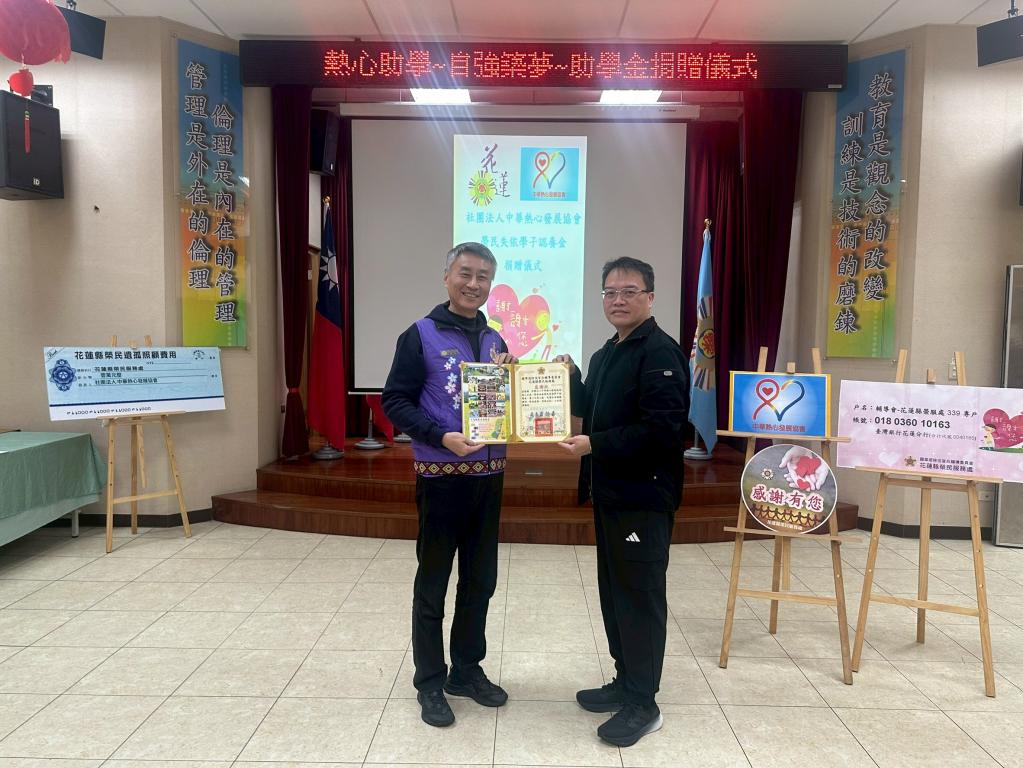 【勁報記者于郁金/花蓮報導】在求學路上,有一份溫暖支持,往往能成為弱勢學子持續向前力量;社團法人中華熱心發展協會理事長鄭宇明、黃信雄秘書近日送愛到花蓮,捐贈「榮民自強學子助學金」,用實際行動為榮民子女求學之路注入希望與勇氣。