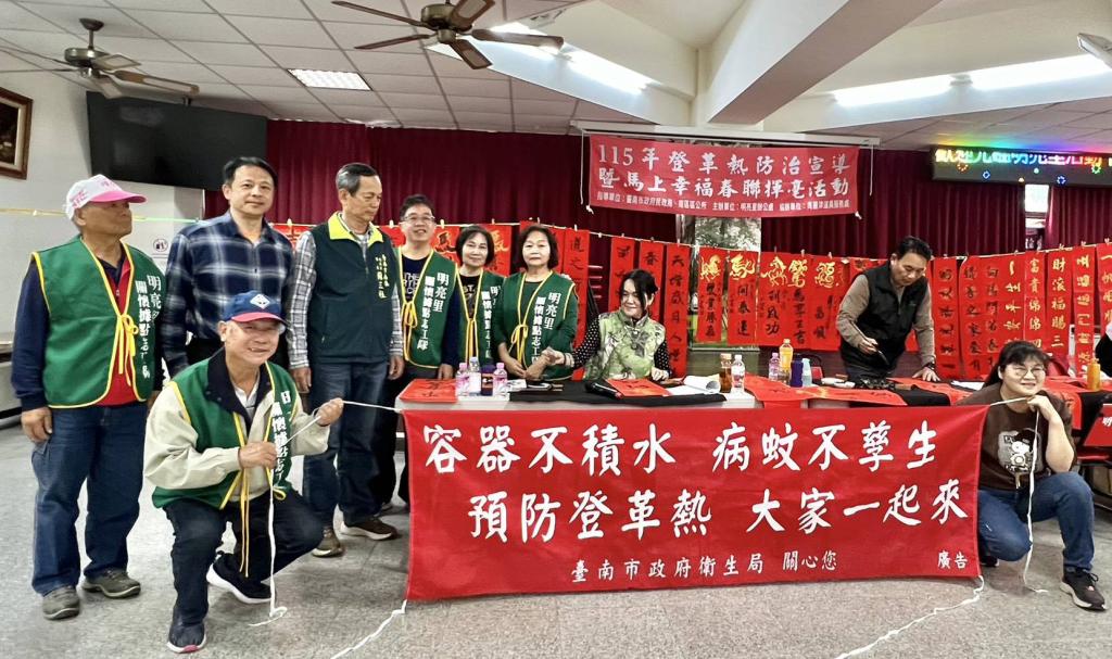 本次活動在臺南市政府民政局指導下,由明亮里辦公處主辦,周麗津議員辦公處協辦,結合登革熱防治宣導與春聯揮毫藝術,透過寓教於樂方式,讓防疫觀念深入社區、落實生活。
