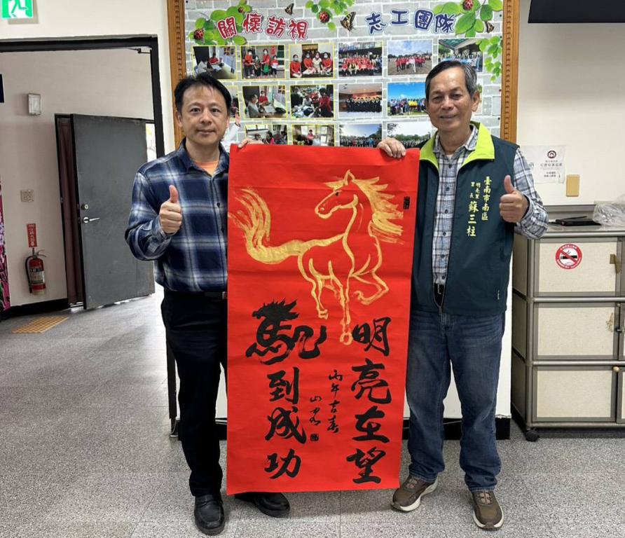 吳福山老師表示:今年以馬為主題,結合書畫寫意及吉祥諧音,創作出龍馬精神合體字、馬喜舞春「也是有餘」,馬享五吉「吉利、吉祥、吉慶、吉兆、吉運」;另有民眾喜歡吉祥大數字眼有:「萬」馬奔騰、「億」馬當先、「兆」馬看發等,讓民眾了解「蛛絲馬跡」典故;筆墨生輝、吉語連連,為里民寫下滿滿祝福;字裡行間不僅象徵新年吉祥,更寄託對社區平安、幸福與發展期許。
