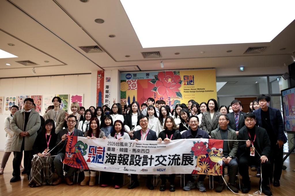 【勁報記者于郁金/臺南報導】「2026台風來了─臺灣、韓國、馬來西亞海報設計交流展」由台南應用科技大學視覺傳達設計系與韓國仁德大學視覺傳達設計系共同主辦,於2月2日在韓國首爾仁德大學舉行開幕儀式;展覽匯集臺灣、韓國與馬來西亞三國、4所大學,包括台南應用科技大學、仁德大學、馬來西亞藝術學院、勤益科技大學,共計60件海報設計作品,展現亞洲設計教育跨國交流豐碩成果。