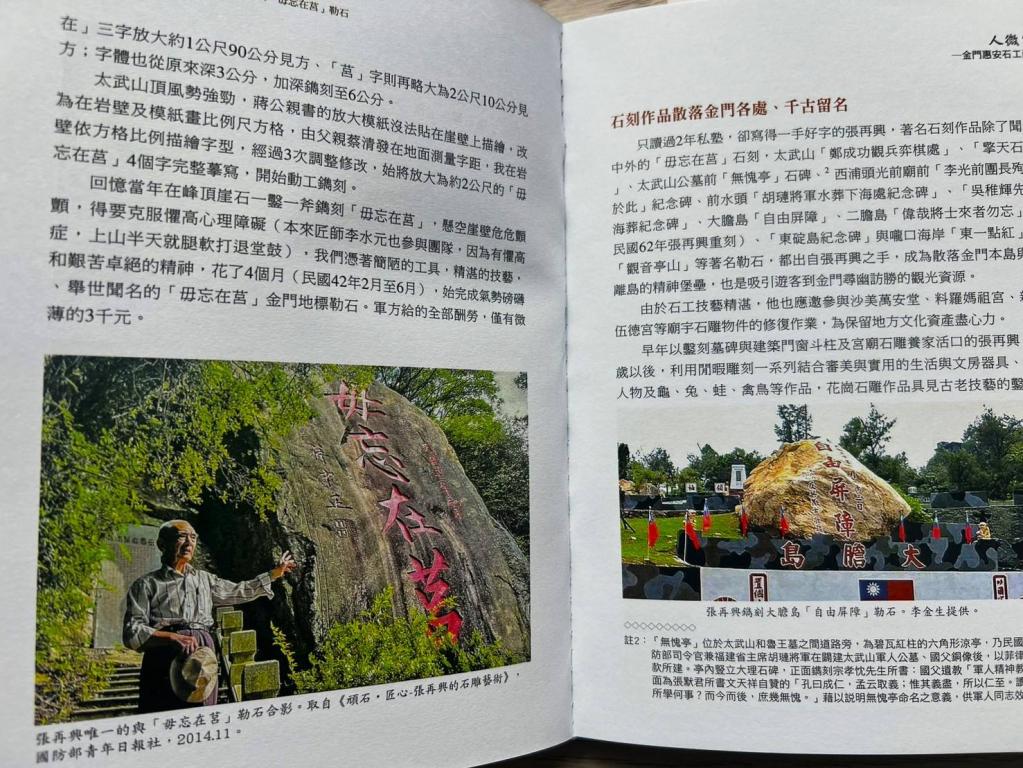 《人微字金─金門惠安石工兩岸情》書中鉅細靡遺,補足人們在檔案文獻和新聞中無法知道金門著名摩崖石刻幕後脈絡和細節,特別是經由實際參與的基層職人之口,更具說服力而可貴;訪談對象娓娓道來過往戰時流離歲月滄桑,說的是石匠的一生,也更敘說著大時代小人物的惠安石工悲歡離合故事。 (《金門將軍學校》乙書撰述作者陳永富提供照片)