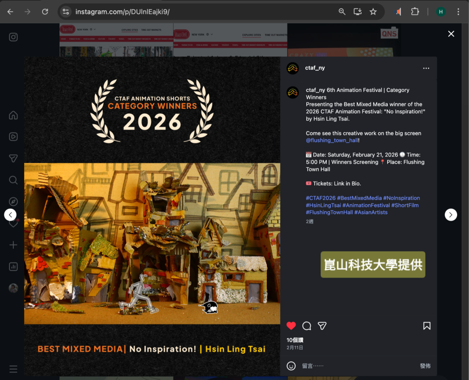 【勁報記者于郁金/臺南報導】崑山科技大學視覺傳達設計系學生在國際動畫舞台傳出佳績,114級畢業生動畫作品《No Inspiration! 想不到》於第6屆CTAF Animation Festival(CTAF動畫節)榮獲 Best Mixed Media(最佳複合媒材)獎,作品並於紐約Flushing Town Hall(法拉盛市政廳)大銀幕放映,展現臺灣新銳創作者國際競爭力。