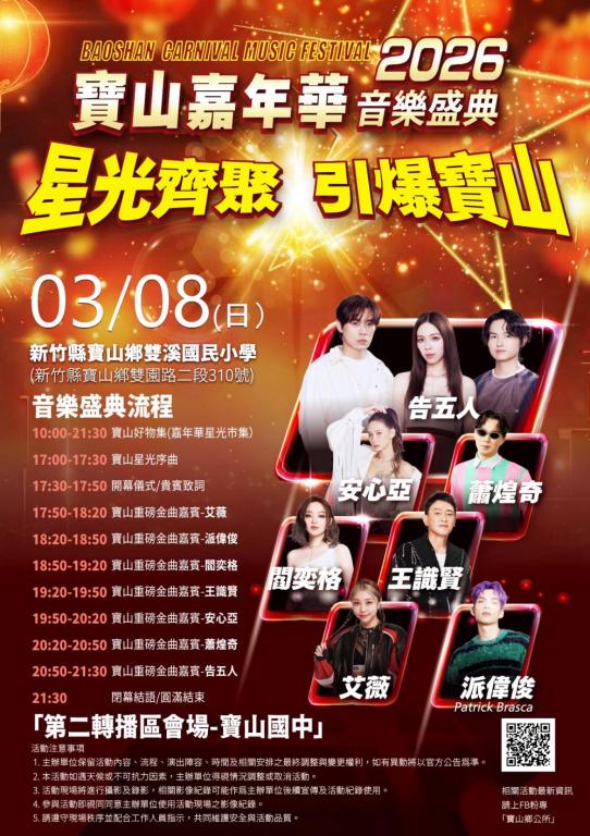 「2026寶山嘉年華音樂盛典」於今(3/8)日在竹縣寶山鄉雙溪國小盛大登場,在精彩音樂演出、特色市集與歡樂氛圍中,讓寶山的夜晚熱鬧非凡,成功打造一場屬於寶山鄉親與全國民眾的春日音樂嘉年華。今早上午先行登場的「寶山好物集」,吸引許多民眾提前到場,晚間17:00起登場的「星光齊聚.引爆寶山」音樂盛典,邀請到超強卡司陣容:有告五人、王識賢、安心亞、蕭煌奇、艾薇、派偉俊、閻奕格等知名藝人!