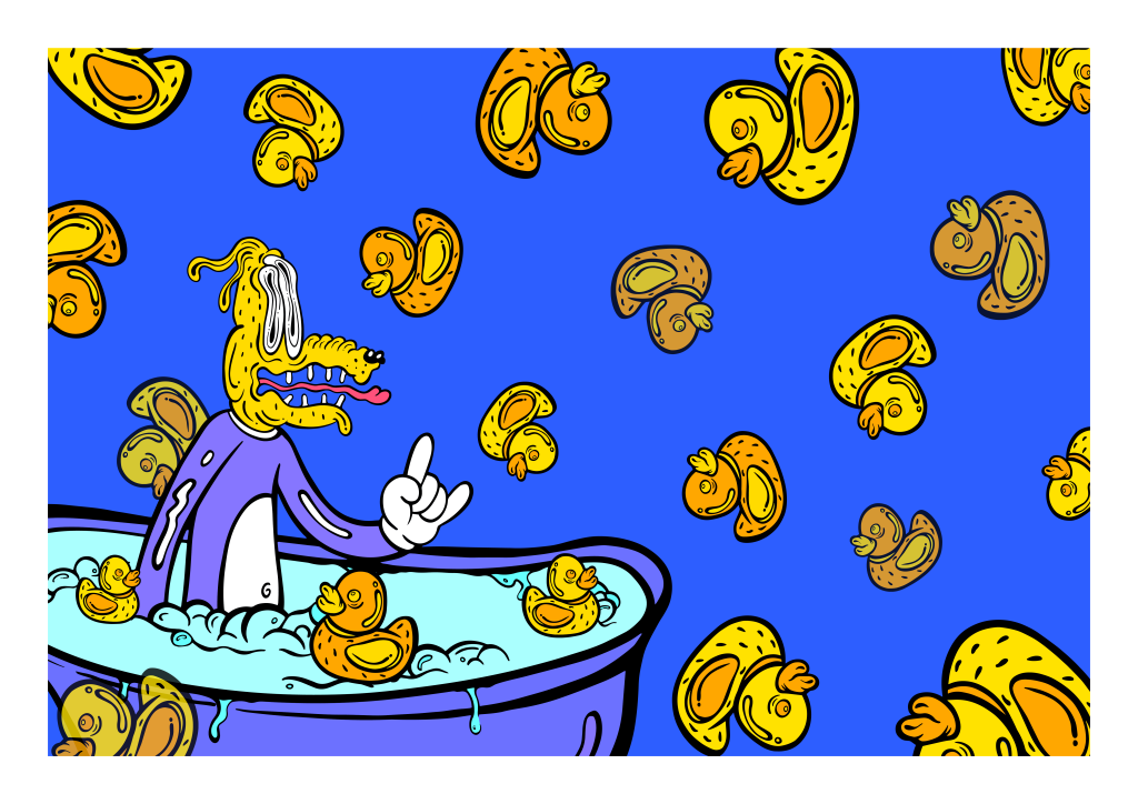 圖/《泡澡》是陳京亨以「美式街頭塗鴉」的叛逆精神打造的多福(DOFU)卡通人物系列作品之一(圖片提供──LABIE.io)