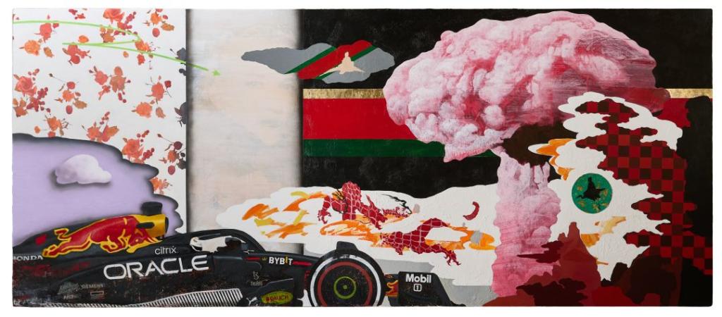 圖/2026高雄藝術博覽會的「潛龍特展」將呈現臺東美展、中山青年藝術獎得主葉哲瑀的作品《假仙境 越界神馳》(110 x 258 cm,金箔、花布、壓克力彩、油彩、木板裱麻布,2025)