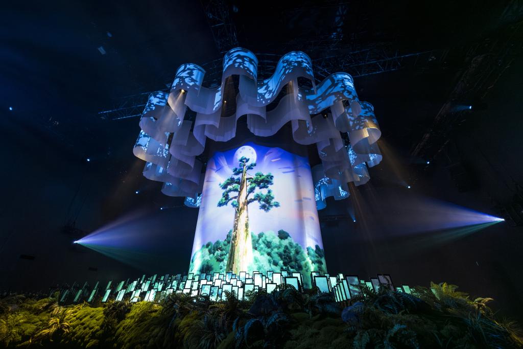 現場展演結合巨型柱狀環形投影、560隻機械手臂以及12聲道環繞聲效系統,打造全感官沉浸式體驗,帶領觀眾走入霧林帶自然場域;現場560隻機械手臂裝置由工研院與穀米共同開發,BITO團隊透過程式設計,使機械手臂能以科技方式模擬生物動態,從500多隻蝴蝶的飛舞姿態,到整片草地隨風搖曳,甚至動物掠影穿林的瞬間,皆在科技與藝術融合之中生動呈現,象徵這片土地多元、包容與韌性精神。