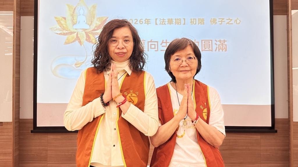 ▲蕭愛芬(右)和莫心萱(左)歡喜參加法華期共學,讓願力彼此支持、互相增上,修行也能走得更長遠。(圖/靈鷲山佛教教團提供)