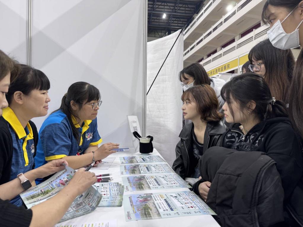 開幕式後徵才活動正式展開,為吸引人才應徵,有直接派主管到場面試,也有贈送精美紀念品、張貼薪資和各項福利海報吸睛;學生也趁此機會貨比三家,選擇中意企業投遞履歷,希望6月畢業能和職場就業無接軌;李碧娥校長也偕同與會貴賓向各醫療及企業攤位致意,為求職面試學生加油打氣。