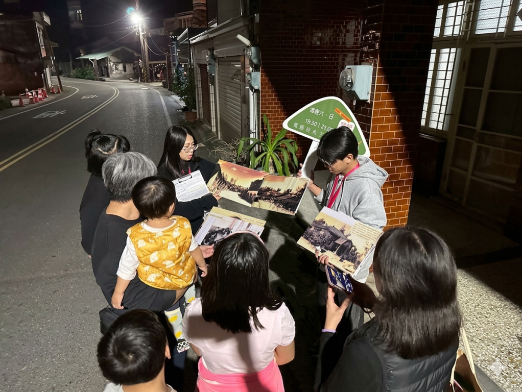 為讓大家不只「看展」,更實際走進龍崎,在展覽執行過程中,空設系銜接水保局114年大專院校農村實踐共創計畫「農藝紮根」,由參與計畫的同學們在展期間規劃多場夜間版「龍崎老街說空間」導覽活動,由師生帶隊陪同民眾在夜色中穿梭老街巷弄;參與者一邊對照歷史照片,一邊觀察現地街屋立面變化、坡道起伏與騎樓下仍可見的使用痕跡,親身感受空間如何在日常使用與時間累積中慢慢變形、改變功能,卻仍保有熟悉情感線索。