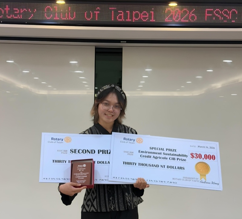(2)第2名暨環境永續特別獎:Rasa-Lâng — 連結之心,得獎人為Sharon Caroline Adam(國際企業系);該作品聚焦高齡社會中語言溝通障礙問題,運用臺灣本土TAIDE人工智慧技術,實現台語長者與外籍照護者間之即時翻譯,促進照護品質與人際理解,並兼顧社會公平與永續發展,榮獲法國農業信貸銀行環境永續特別獎(新臺幣30,000元)。
