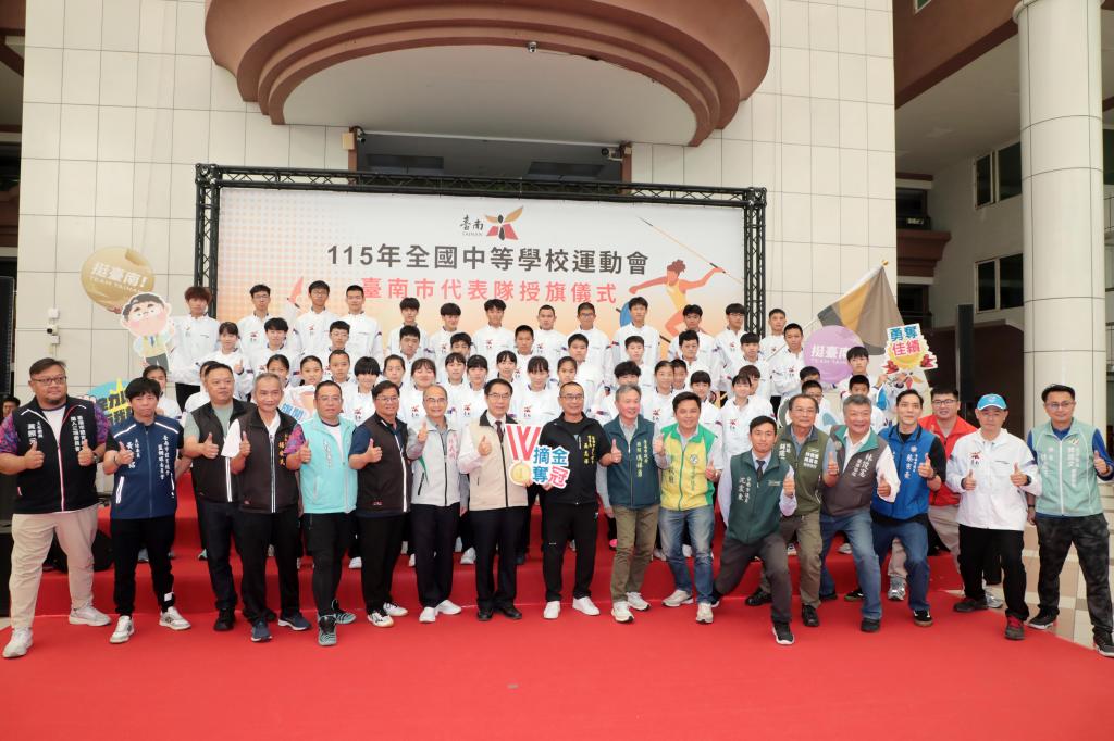 【勁報記者于郁金/臺南報導】115年全國中等學校運動會將於4月18日至23日於嘉義縣舉行,臺南市政府8日在永華市政中心舉行授旗儀式,由市長黃偉哲親自將市旗交予台南市體育總會理事長吳志祥,象徵臺南市代表隊接旗出征;黃偉哲期勉臺南小將以最佳狀態迎戰全國好手,發揮訓練成果,在競技舞台上突破自我、再創佳績。