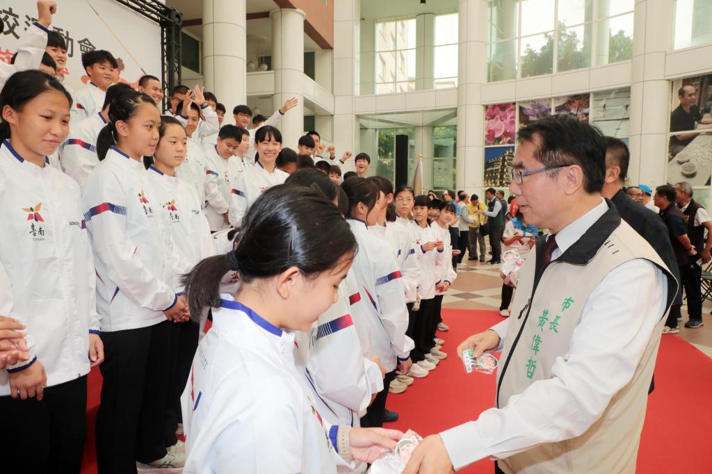 黃偉哲進一步表示,市府將持續作為選手最堅強後盾,不論是在訓練資源、獎勵制度或運動科學支援等方面,皆會「提升再提升」,讓選手無後顧之憂,全力拚戰賽場,並祝福臺南代表隊在本屆全中運「馬到成功」、大放異彩。